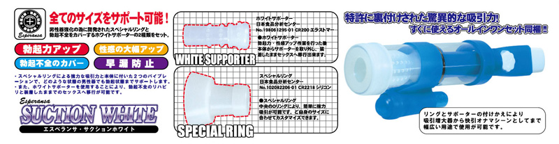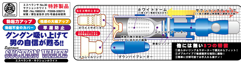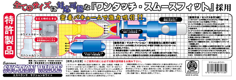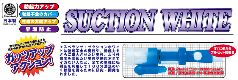 制的に勃たせフィニッシュさせる究極のマシーン完成!そんじょそこらの類似マシンとは違い、構造がすばらしい!外国製のマシンが多い中、安全と信頼の日本製で素材の品質も◎。通常のマシンは内部を真空状態にしてオトコを強制的にガチガチにさせるだけなのに、サクションホワイトはさらに快感ホールを組み合わせることで、吸引&快感のWアタックで攻めたてるんだ。強オナマシーンから増大ポンプまでこれ一台でフルカバー!本体サイズ:全長365mm×太さ52mm