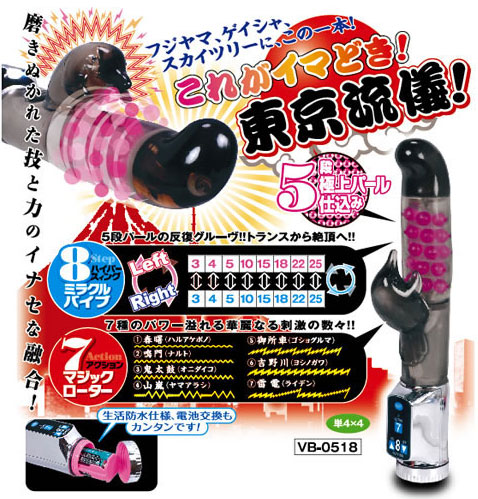 磨きぬかれた技と力のイナセな融合!これがイマどき、東京流儀!まず最初に目に飛び込んでくるのは、豪華に配列された5段極上ピンクパール!ぐるぐると回転しながらかき回す様は、他のバイブでは再現できないほどのパワフルな動きを堪能することができます。さらに、スイングには8パターン、子機振動は7パターンを搭載しました。シンプルな動きは必要なく、イカせるまでとことん快感を与え続けられるバイブです。生活防水仕様なので、万が一濡れすぎても安心です。中途半端に責めるのが苦手な方はこのバイブをお使いいただき、手加減のない本当の快感を手に入れてください。