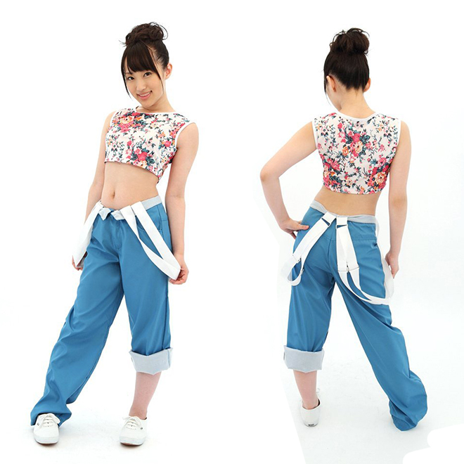 トップスとパンツでカジュアルにキメたダンスコスチューム。トップスはベリーショートで大胆にウエストラインを露出したデザインになっています。パンツにはサスペンダーが施され、オシャレ感が大幅アップ!爽やかなイメージで着こなすオシャレな一着です。サイズ:B78-88cm W58-70cm H87-95cmセット内容:トップス、パンツ
