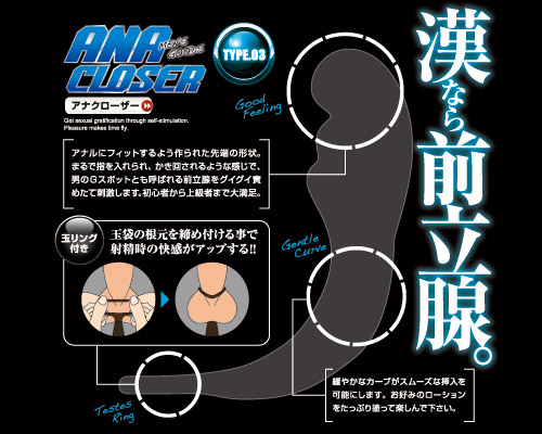 漢なら前立腺を責めてこそ!そんな想いを込めた前立腺を刺激するのに特化した、漢のためのアナルグッズ「アナクローザー」。こちらの「TYPE03」は、アナルにフィットするよう作られた先端の形状が特徴の一本です。適度な大きさも兼ね備えているので、しっかりと前立腺を圧迫することで、ドライオーガズムへの到達もスムーズにさせてくれることでしょう。また、本体の持ち手部分はリング状になっていて、このリングを玉にひっかけることで、玉の締め付けも同時に行ってくれるという優れもの!「男性でも、女性のように何回も繰り返してオーガズムに達したい・・・」そんな貴方の想いに応えたいアイテムです。