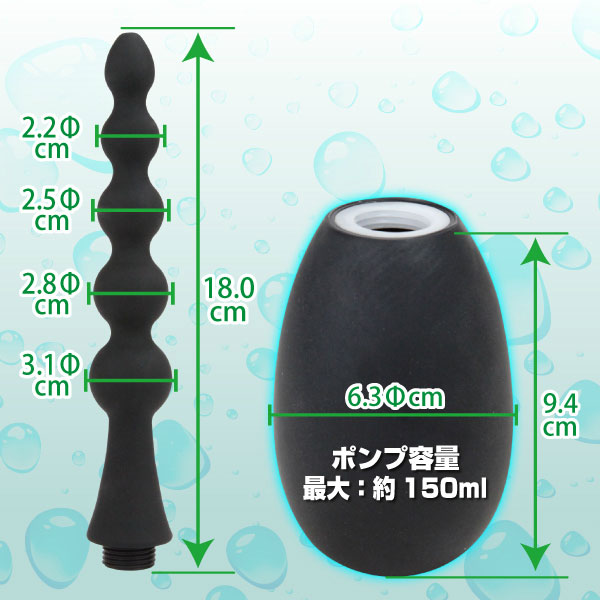 注入・洗浄・快感、全ての要素を兼ね備えたアナル洗浄用ディルド「エイナスウォッシャー」。大容量150mlを注入できるポンプと、先端に穴の空いたノズルが別々になっていて、従来のポンプなら、圧縮して液体を注入するため、しっかりと液体が入らなかったりと問題がありましたが、このエイナスウォッシャーはポンプ内に液体を注入してからノズルをはめることで、たっぷりとポンプ内に液体を注ぎ込むことができます。こちらの「TYPE C」は、アナルディルドとしてもお使いいただける形状で、洗浄のみならず、アナルへの刺激にも役立つデザインです。本体の素材も、高級シリコンを使用しており、なめらかな挿入をサポートし安心してお使いいただけます。アナルプレイの際にはぜひひとつは持っておきたい新しいカタチのアナル洗浄アイテムです。