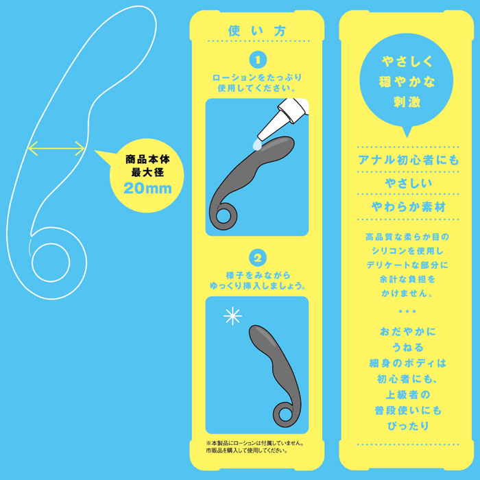 アナル初心者に優しいスティックバイブ!「はじめてのアナニー」をコンセプトにした、やわらか素材の初心者にもやさしいアナルスティック「ぷにっとアナルナロースティック」。おだやかにうねる細身のボディは初心者にも上級者の普段使いにもピッタリ!汚れの目立ちにくいマットブラック仕様。高品質な柔らかめのシリコンを使用し、デリケートな部分に余計な負担をかけません。優しく穏やかな刺激に興奮度が高まります。市販のローションをたっぷり使ってお楽しみ下さい。サイズ:15.5×6.5×5.0cm