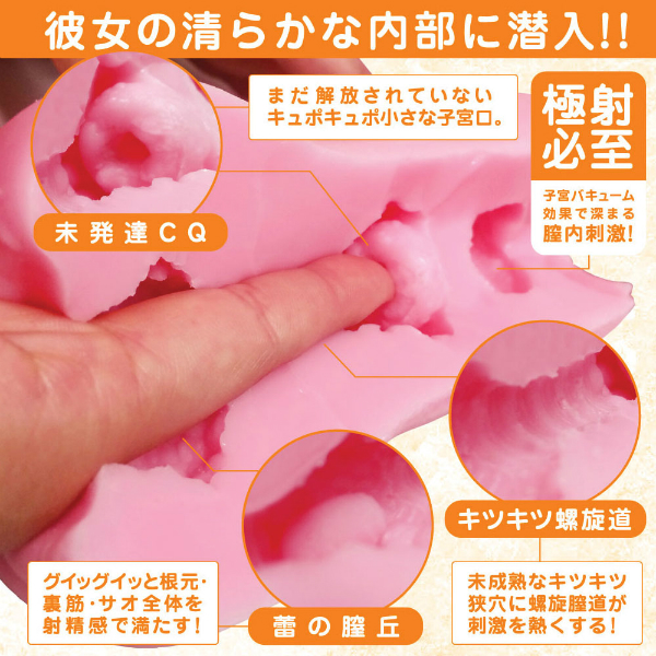 ロリっ子のキツキツ子宮を疑似体験! キツキツのCQ(子宮)が大好きなあなたに贈る、未経験の膣内を再現したオナホール「ロリCQ」。挿入直後、未発達の膣丘があり、内部でしっかりと締めつけてくれます。さらに奥へと進むと、未成熟なキツキツ狭穴に螺旋膣道が刺激的な快感を与えてくれます。最深部手前にはまだ解放されていない小さな子宮口があり、最深部にはバキューム効果が期待できるエアポケットを採用しました。しっかり締めつけて強力バキュームで吸い上げてくれるから、最後の一滴まで確実に搾り取ってくれます。性への快感をしらない少女へ挿入する快感をたっぷりとお楽しみください。