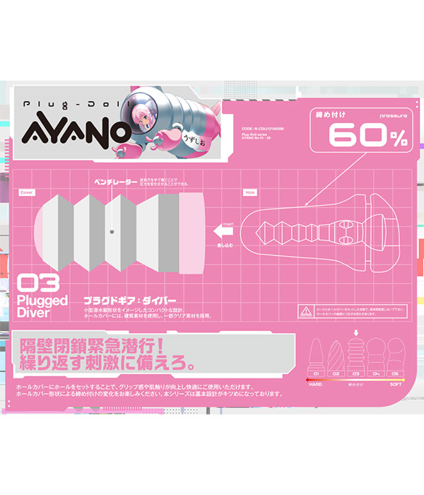 隔壁閉鎖緊急潜行!繰り返す刺激に備えろ! 世界初!12分の1サイズフィギュア+オナホール+オナホールカバーのスペシャルセット!「フィギュア+オナホールセット Plug-Doll AYANO プラグドダイバー」。締め付け60%!小型潜水艇形状をイメージしたコンパクトな設計。ホールカバーには、安心感のある硬質素材を使用し、本体上部にクリア素材を採用。グリップ感や肌触りが向上!空気穴を手で塞ぐことで圧力を変化させる事ができるので、アナタ好みの締め付けをお楽しみ頂けます!シリーズ5種類のオナホールカバーとそれぞれ異なる締め付け度を味わえます。10分の1の確率で胸部ボーナスパーツが追加封入されているので組み合わせて遊べます。下着を穿き忘れたAYANOがいるかもしれないので見つけた時は温かく見守りましょう!さらに!Plug Dollシリーズ 5種全種購入して応募券を集めると、1/2スケール「プラグドールアヤノ」フィギュアが抽選で10名様に当たるキャンペーンを実施!サイズは高さ:40cm、幅:54cm、奥行き:24cm!胸パーツが外せたりスカートが捲れたり、背中にオナホールを保管できたりと様々な楽しみ方ができます!応募締切:2014年12月31日(水)※消印有効 Plug-Doll AYANOが活躍する未来を一足先に体験してください!