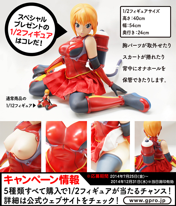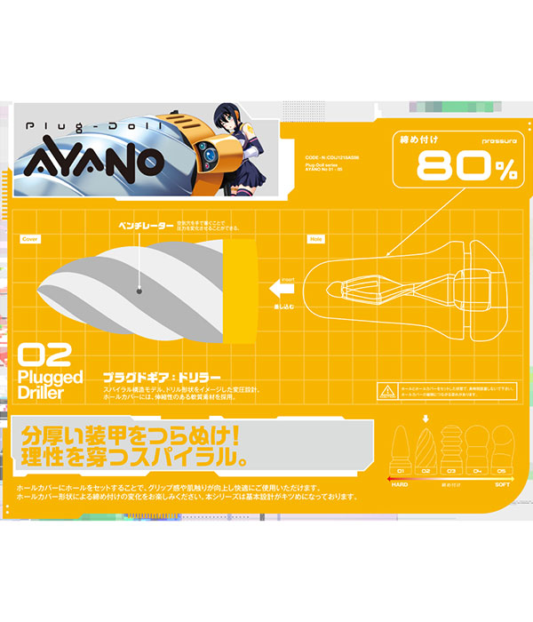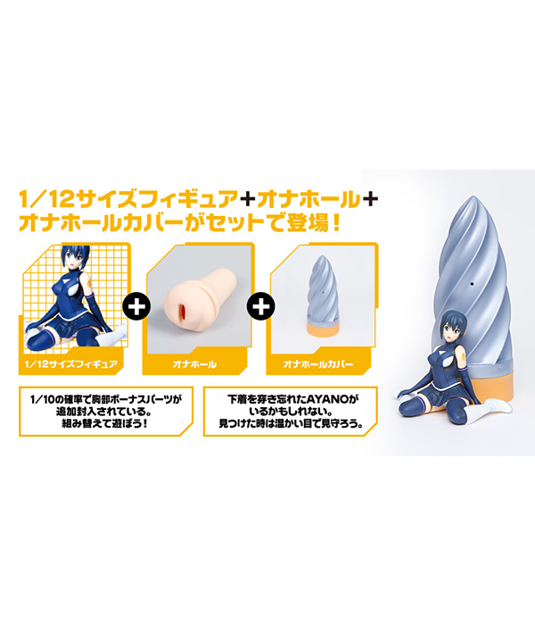 分厚い装甲をつらぬけ!理性を穿つスパイラル! 世界初!12分の1サイズフィギュア+オナホール+オナホールカバーのスペシャルセット!「フィギュア+オナホールセット Plug-Doll AYANO プラグドドリラー」。スパイラル構造モデルで締め付け80%!ドリル形状をイメージした変圧設計。ホールカバーには伸縮性のある軟質素材を採用しているので、グリップ感や肌触りが向上!空気穴を手で塞ぐことで圧力を変化させる事ができるので、アナタ好みの締め付けをお楽しみ頂けます!シリーズ5種類のオナホールカバーとそれぞれ異なる締め付け度を味わえます。10分の1の確率で胸部ボーナスパーツが追加封入されているので組み合わせて遊べます。下着を穿き忘れたAYANOがいるかもしれないので見つけた時は温かく見守りましょう!さらに!Plug Dollシリーズ 5種全種購入して応募券を集めると、1/2スケール「プラグドールアヤノ」フィギュアが抽選で10名様に当たるキャンペーンを実施!サイズは高さ:40cm、幅:54cm、奥行き:24cm!胸パーツが外せたりスカートが捲れたり、背中にオナホールを保管できたりと様々な楽しみ方ができます!応募締切:2014年12月31日(水)※消印有効 Plug-Doll AYANOが活躍する未来を一足先に体験してください!
