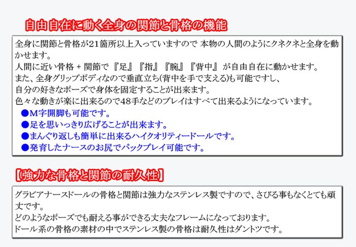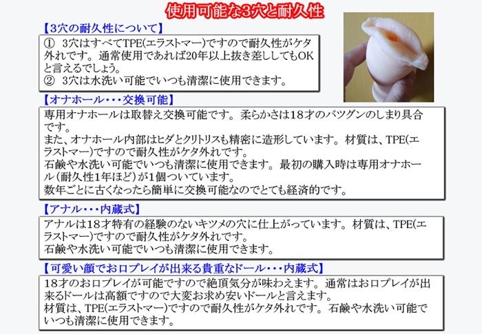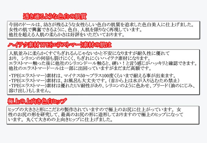 サイズ:全長145cm、バスト80cm(Eカップ)、ウエスト52cm、ヒップ82cm、足サイズ20.5cm 重量:26kg 3穴タイプ(口、ヴァギナ、アナル)ヴァギナのみ交換可能 セット内容:本体、取り外し可能ウイッグ、専用ホール、ドール収納布団、下着上下、つけ爪と爪の接着剤