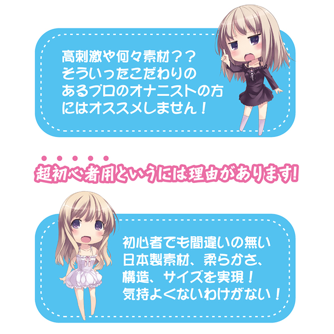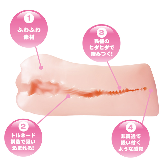 超初心者用というには理由があります!全初心者でも間違いの無い「柔らかさ」「構造」「サイズ」を再現!もちろん安心安全の日本製。ふわふわ素材で初めてでも全く抵抗のない使い心地。トルネード構造で吸い込まれる快感がたまりません!奥に進むにつれて鉄板のヒダヒダが絡みつき、非貫通で吸い付くような感覚がクセになります。これで気持ち良くないわけがない!オナホデビューに最適のアイテムです。パッケージサイズ:20.0×14.0×9.5cm付属品:エクセレントローション15ml