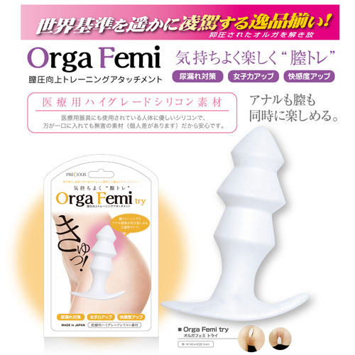 膣トレで女子力UP! 気持ちよく楽しく膣トレがしたい!そんな女性の願望を叶えてくれるアイテム「オルガフェミ」。モニターを繰り返し開発された日本人女性のアソコにピッタリとフィットする特殊な形状になっているので、装着後に抜けにくい特性があります。肌に装着するものなので、素材は医療用のハイグレードシリコンを採用。安心してご使用いただけます。こちらの「トライ」タイプは、段差のある構造になっていて、一度挿入すると抜けにくい性質があります。また、アナル拡張としてもお使いいただくことができる一石二鳥のアイテム。ぴったりとフィットしてくれるから抜けにくく、膣圧を向上させるトレーニングには最適です。女子力アップに効果を発揮してくれる、女性磨きのアイテムです。