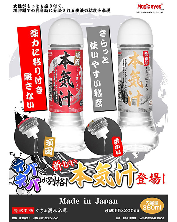 ホンモノの愛液!?臨場感溢れる本気汁ローションこのネバネバ感がクセになる!本気で感じた女性が分泌する愛液を再現したローション「柔かい 本気汁 360ml」。女性が最も盛りつく排卵期での興奮時に分泌される愛液の粘度を完全再現。さらっとした使いやすい粘度で、柔らかい使用感を実現しました。オナホールに使用することで、その臨場感はまさに本物以上!是非、この快感をお試しください。内容量:360ml