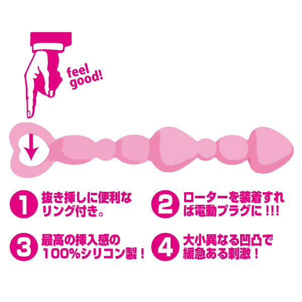 気持ちよさが奥まで届くアナルバイブ ハート型のキュートな持ち手が印象的なアナルバイブ「アイラブエイナス スリムクイーン」。その名の通り、スリムなデザインとなっていて、初心者の方でも安心してお使いいただけるサイズとなっています。こちらの「Stage1」は、大きな球体が先端と中央に2個配置され、その間には小さな球体が施された形状となっています。挿入をサポートする高級シリコン100%使用。抜き差しに便利な取っ手付きだから、安心してお使いいただけます。また、この取ってに別売のローターを取りつけることで、電動アナルバイブとしてもお楽しみいただけます。使い方次第であらゆる快感が得られる、シンプル設計だけどしっかり者の一本です。