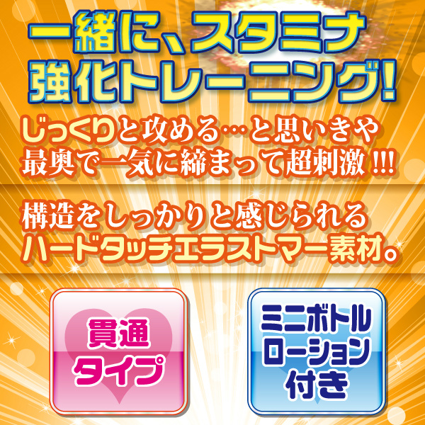 アソコを鍛えて快感を楽しむオナホール 最後までまったりと締めつけて、アソコをじっくりと鍛えるオナホール「アソコを鍛える秘密のレッスン 1」。挿入口は、広い入口構造となっていて、突起群が亀頭から竿へと絡みつきながら奥へと誘ってくれます。その先には、まったり感が続くウェーブ構造と細やかなヒダが竿全体をじっくりと擦り上げます。最深部は、急激に窄まる締め付けゾーンを採用し、亀頭に激しい刺激を与えてくれます。入口付近の無数の大きな突起が優しく包み込み、ずっと挿入していたくなる様な気持ちよさが持続し、段々と締まる細やかなヒダヒダが亀頭に引っかかり気を抜くとスグにイッちゃいそうになります。内部構造がしっかりと感じられるハードタッチエラストマー素材をを採用。耐久性にも優れているので、丁寧に扱えば繰り返しお使いいただくことが可能です。オナニーで快感を楽しみながら、じっくりと男性器を鍛えることができるオススメのオナホールです。