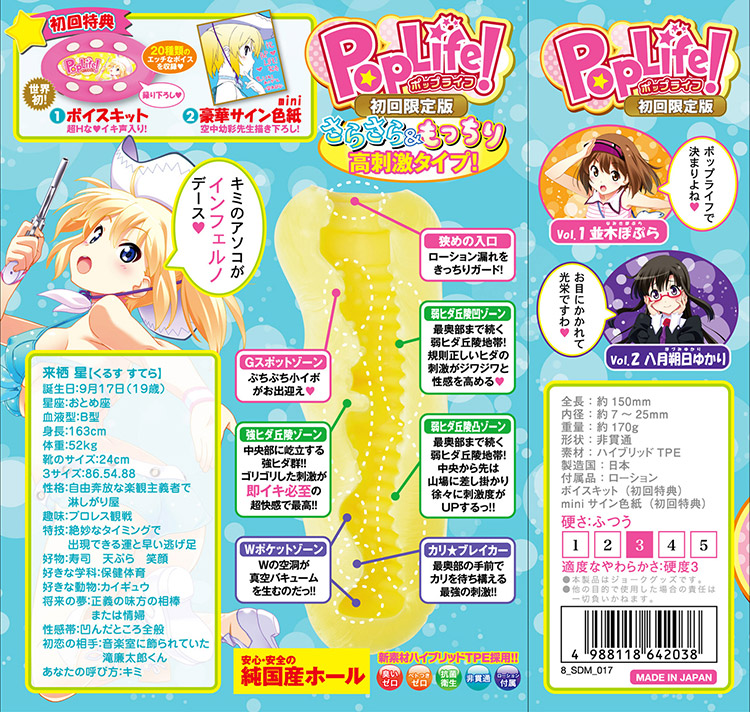 シンプルさがちょうどいい!快感オナホール!イラストレーターでご活躍されている、空中幼彩氏がパッケージをデザインしたことで話題独占中のオナホPOPLIFE!」がついに入荷!構造は3種類ともシンプルなストレートタイプ。上部の大きなひだと下部の整列したヒダが激しくペニス絡みつきます!!新素材ハイブリッドTPEを使用しているのでボディは、ふわとろ&もちもち☆匂い、べたつきなどもない最高素材です。本体サイズ:14.5×Φ5.5cmパッケージサイズ:イズ:15.5×6.5×21.0cm
