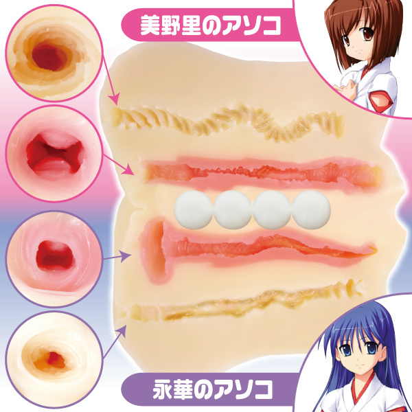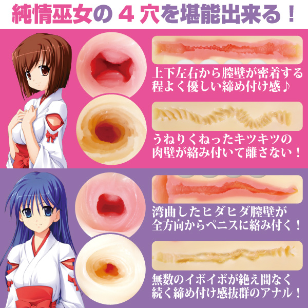 驚きの4穴プレイ! 一人でも3Pが堪能できる「巫女乙女洗脳調教」は、なんと驚きの4穴プレイ仕様です。もちろんそれぞれの穴は全く別の作りになってますので、穴を入れ替える度に刺激に変化を感じます。極めつけは、内部に仕込まれた4連刺激球が生み出す膣内コリコリ感です。膣は純潔ピンク色の弾力ある二層構造で、程よい締め付け感がたまりません。アナルはサオにキュンキュン絡み、締め付けるキツキツの挿入感が快楽を刺激いたします。あなたの快楽と支配欲をしっかり満たしてくれるオナホールです。