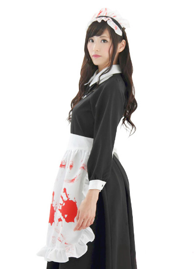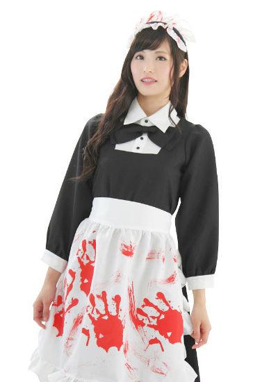 血のり手形がべったり!びっくりホラーメイド服! エプロンに赤い手形がべったり・・!二度見してしまうほどのインパクトありなホラーメイドさん!シンプルな白黒デザインで、ワンピースは少し丈が長く、お上品な仕上がりになっています。フリルエプロンは取り外しができるので、お手持ちのエプロンをつけると普通のメイド服としてもお使いいただけます。セットのカチューシャにも血のペイントがついた、恐ろしさ満点のメイドさんです☆