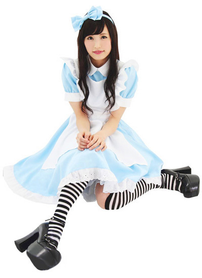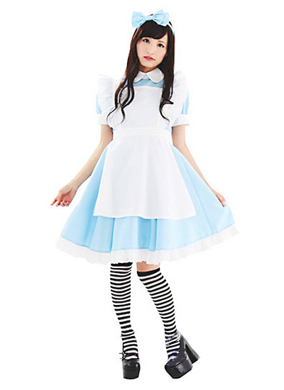 アリス風☆膝丈お嬢様ラインワンピース爽やかな水色と白のカラーで仕上げたフェミニンメイド服☆セクシーすぎないひざ丈で作られたこのメイド服は、シンプルですがエプロンのフリルやセットのリボンカチューシャなど、細部に可愛さをON♪少し派手めなニーハイソックスやタイツなどと相性抜群◎初心者でも着やすい定番メイド服になっています。サイズ:Mサイズ (B78-88、W58-70、H87-95) セット内容:ワンピース、エプロン、リボンカチューシャ