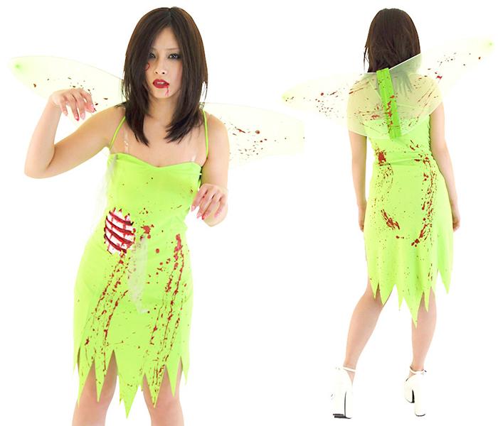ハロウィンにオススメのゾンビコスチュームおとぎ話の中からでてきたような黄緑のワンピースと羽に血のりがべったり・・!ホラーテイストになったこのコスチュームはあばら骨が出ているようなデザインがより本格的で、思わず恐れてしまいそう・・。メルヘンなおとぎの国とホラーがコラボした恐怖度満点のコスチュームになっています。サイズ:Mサイズ (B78-88、W58-70、H87-95) セット内容:ワンピース、羽