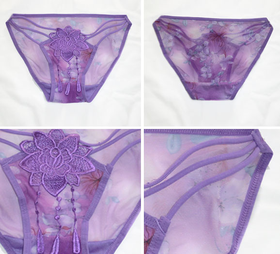 シースルー花柄模様とフロント花コサージュがエレガント♪フロントの花コサージュが特徴的なキレイめショーツが登場♪エレガントなパープルカラーが優しく、サイド紐は3ラインになっており、大人セクシーを演出してくれます◎フロントとヒップはシースルー生地に花柄模様がプリントされているのでボディをより美しく魅せてくれます☆露出度は低めですが、デザイン性が高くどんな方でも履けちゃうショーツになっています!サイズ:フリーサイズ(Mサイズ相当)