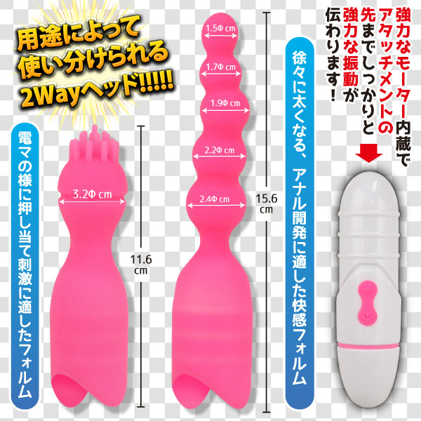 二種のアタッチメントがアナタの快感を呼び覚ます! 用途によって使い分けられる2wayヘッドの着せ替えバイブレーター「ツーウェイエクスタシー エイナス」。取り外し可能な2種のシリコンヘッドが付属していて、アナタの気分に合わせて付け替えてお楽しみいただけます。バイブ本体は強力なバイブレーションで、アタッチメント先端までしっかりと刺激を伝え、電マの様に押し当て刺激に適したブラシヘッドと、徐々に太くなるアナル開発に適したエイナスヘッドをセットにしました。動作は、12種類の振動パターンを搭載しており、アタッチメントの付け替えと相まって飽きのこない仕上がりとなっています。静音設計で生活防水機能も施したオススメの一本です。