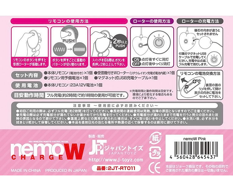 ¿Íµ¤¤Î¹â¤¤¶¯ÎÏ¥í¡¼¥¿¡¼¤Î¥Ä¥¤¥ó¥¿¥¤¥×¡ª¶¯Îϥ磻¥ä¥ì¥¹¤Ç³Ú¤·¤â¤¦¡ª¥Í¥ª¥ï¥¤¥ä¥ì¥¹¥ê¥â¥³¥ó¥í¡¼¥¿¡¼¡Önemo¡×¤«¤é¶¯Îϥĥ¤¥ó¥í¡¼¥¿¡¼nemoW¤¬Åо졪¤µ¤é¤Ë¥Þ¥°¥Í¥Ã¥ÈUSB½¼ÅŤËÂбþ¤·¡¢¥Õ¥ë½¼ÅŤÇÌó1»þ´Ö¤Î¥×¥ì¥¤¤¬²Äǽ¤Ë¤Ê¤ê¤Þ¤·¤¿¡£ÅëºÜ¤·¤Æ¤¤¤ënemo¥Þ¥¤¥¯¥í¥â¡¼¥¿¡¼¤Ï¡¢·ÚÎ̤ÇÀŲ»À¤â¹â¤¯¡¢Ä¶¿¶Æ°Àǽ¤Ç¤¹¡£ÌµÀþ¥À¥Ö¥ë¥í¡¼¥¿¡¼¤Ê¤Î¤Ç¡¢Æ±»þÆý¼óÀդᡢÆý¼ó¡õ¥¯¥ê¡¢¥¯¥ê¡õç´¡¢¤ª¹¥¤¤Ê¥×¥ì¥¤¤ò³Ú¤·¤á¤Þ¤¹¡£¤µ¤é¤Ëº£¸å¡¢È¯Ç䤵¤ì¤ë¥ª¥×¥·¥ç¥ó¤ä¡¢nemo¥·¥ê¡¼¥º¤È¤ÎÁȤ߹ç¤ï¤»¤Ç¡¢³Ú¤·¤ßÊý¤â̵¸ÂÂç¤Ë¹¤¬¤ê¤Þ¤¹¡£nemo¥·¥ê¡¼¥º¤ÏÀ¸³èËɿ嵡ǽ¤Î¤¹¤Ù¤¹¤Ù¥Þ¥Ã¥È¥³¡¼¥Æ¥£¥ó¥°¡¢¥í¡¼¥¿¡¼¤Ï´ÝÀö¤¤¤Ç¤¤ë¤Î¤Ç±ÒÀ¸Åª¤Ë¤âGOOD!¥ï¥ó¥Ü¥¿¥ó¤Ç¥ª¥ó¡¦¥ª¥Õ¡¦¥â¡¼¥ÉÀÚÂØ¤¬²Äǽ¡£10mÀè¤ÎÁê¼ê¤Þ¤ÇÆÏ¤¯¥Ï¥¤¥Ñ¥ï¡¼¤Înemo¤Ç¿·¤·¤¤À¤³¦¤òÂ䶤·¤è¤¦¡£¥«¥é¡¼¤Ï¥¹¥¿¥¤¥ê¥Ã¥·¥å¤Ê¥Ö¥é¥Ã¥¯¡£¥ê¥â¥³¥ó¤Îưºî³ÎǧÍÑÅÅÃÓÉÕ¤¡£¤´»ÈÍѾå¤ÎÃí°Õ»ö¹à¡ËÜÂÎÉÕ°¤ÎÅÅÃÓ¤ÈͽÈ÷¤ÎÅÅÃÓ¤ÏÆ°ºî³ÎǧÍѤǤ¹¡£¤ªÁáÌܤ˿·¤·¤¤Êª¤Ë¤ª¼èÂØ¤¨²¼¤µ¤¤¡£¢¿¶Æ°¤µ¤»¤Æ¤¤¤Ê¤¯¤Æ¤â¥í¡¼¥¿¡¼¤ÏÅÅÇȼõ¿®¤Î°Ù¤ËÅÅÃÓ¤ò¾ÃÈñ¤·¤Æ¤¤¤Þ¤¹¡£»ÈÍѸå¤Ïɬ¤ºÅŸ»¤òOFF¤Ë¤·¤ÆÊݴɤ·¤Æ²¼¤µ¤¤¡££¥ê¥â¥³¥óÍÑÅÅÃÓ¤ÎÊüÅÅËɻߥե£¥ë¥à¤ò¼è¤ê³°¤·¤Æ¤«¤é¤´»ÈÍѤ¯¤À¤µ¤¤¡£ËÜÂÎ¥µ¥¤¥º¡§2.3¡ß¦µ0.8cm¥Ñ¥Ã¥±¡¼¥¸¥µ¥¤¥º¡§12.0¡ß18.0¡ß3.7cm½ÅÎÌ¡§120g