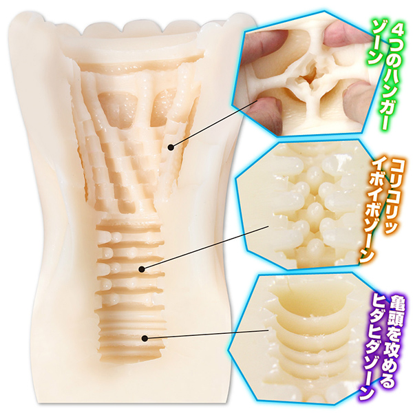 予測不能の4本ハンガー! 4本のハンガーでペニスを宙釣りに!ピストンをする度に、予測不能の刺激があなたを責める!入口に配置された4つのハンガーゾーンで宙釣りにされた後は、中腹部に配置されたコリコリッのイボイボゾーンがピストン運動に併せて予測不能に亀頭を刺激、ガマンができなくなったら、更に奥深く子宮ゾーンへ浸入するとそこに待ち構えているのは、横ヒダヒダゾーン!暴発しそうな程のビンビンの亀頭をシッポリ咥えこんで、全ての精力を奪い取る!今夜もいっぱいご奉仕してもらってくださいね!