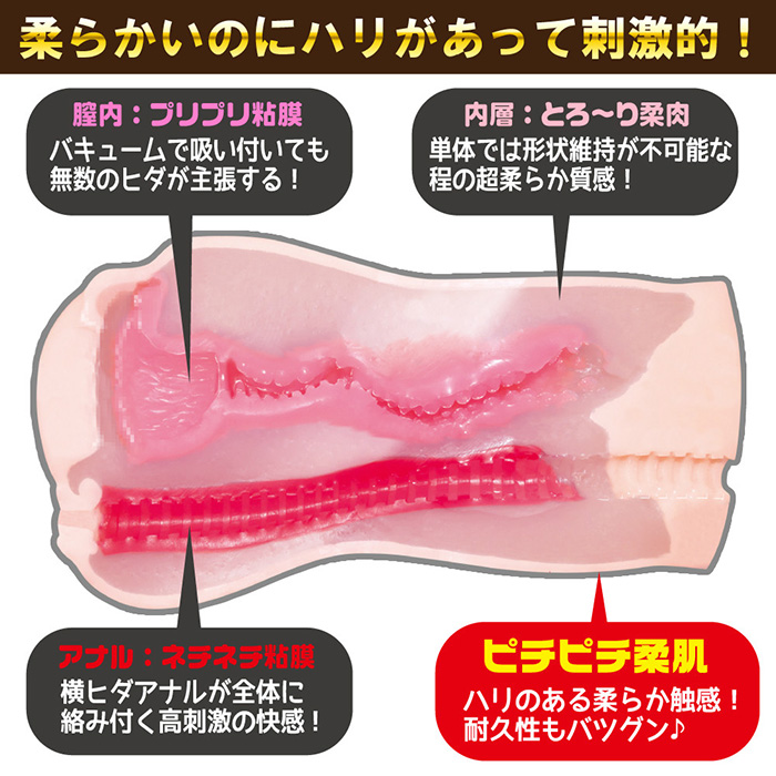 4種類の素材が織りなす極上の快感 4種類の素材で少女の柔肌を再現したオナホール「クワトロ天然ガール」。ヴァギナとアナルの二穴構造で、さらに内部も二層構造で形成された最重量クラスのハンドホールとなっています。このホール最大の特徴として、4つの異なる素材を採用。まずは外側の素材「ピチピチ柔肌」。ハリのある柔らかな触感で、耐久性も抜群の仕上がりです。そのすぐ内側に形成されているのが「とろ〜り柔肉」。単体では形状維持が不可能なくらいの柔らかさで、外側の「ピチピチ柔肌」との相性は抜群。二層構造部分のヴァギナ側には「プリプリ粘膜」素材を採用。バキュームで吸い付いてきて、その吸い付いた粘膜には無数のヒダ形状が張り巡らされています。最後にアナル部分の二層構造素材「ネチネチ粘膜」。横ヒダがアナル全体に絡みついてきて、高刺激の快感を生み出してくれます。このホールは、内部ギミックはそれほど主張するものはありませんが、4種それぞれの素材の違いが、それぞれの素材をサポートしながら最高の快感を生み出すホールとなっています。圧巻の肉厚と素材感を思う存分お楽しみください。