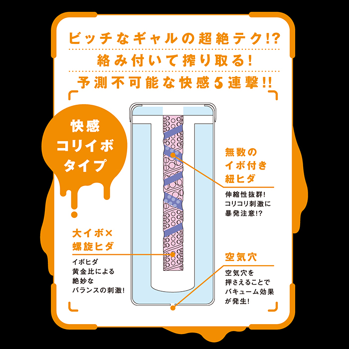 ヒメカノ公式コラボホール!ヒメカノ公式のコラボレーションオナカップ!国産メーカーで製造された肉厚のオナカップで、360°包み込むように無数に広がるイボイボと螺旋ヒダに加え、コリコリとしたつぶつぶがイボがアクセントになり、5本の紐ヒダが予測不能な快感をもたらします。絡みつくワイヤード構造で、使うたびに使用感が変化。潤い・抗菌のヒアルロン酸配合ローション付き。本体サイズ:15cm×6.5cm×6.5cm重量:180g