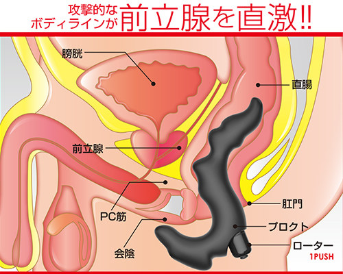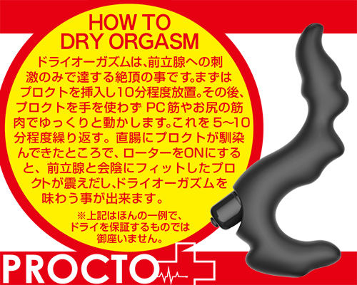 攻撃的なデザインで前立腺を刺激する! 攻撃的なデザインで前立腺を刺激してくれるアナルグッズ「プロクト」。ドライオーガズムとは、射精を伴わなずに絶頂に達することで、ドライオーガズムを体感するには気持ちのモチベーション的な部分が大きいといわれています。そんなドライオーガズムを体感するために開発された「プロクト」。刺激的なデザインとは裏腹に、しっかりと前立腺を刺激し、付属のローターを動作させることで一気にドライオーガズムへと導いてくれます。ローターは脱着が可能なので、ローターを取り外してから洗浄することでいつでも清潔にお使いいただけます。また、このローターを単体として使用するこで、乳首などへのピンポイント刺激も可能。今までのエネマグラ等ではなかなかうまくできなかった方でも、このプロクトならイケるという報告もあります。アナタのドライオーガズムを応援するオススメの一本です。