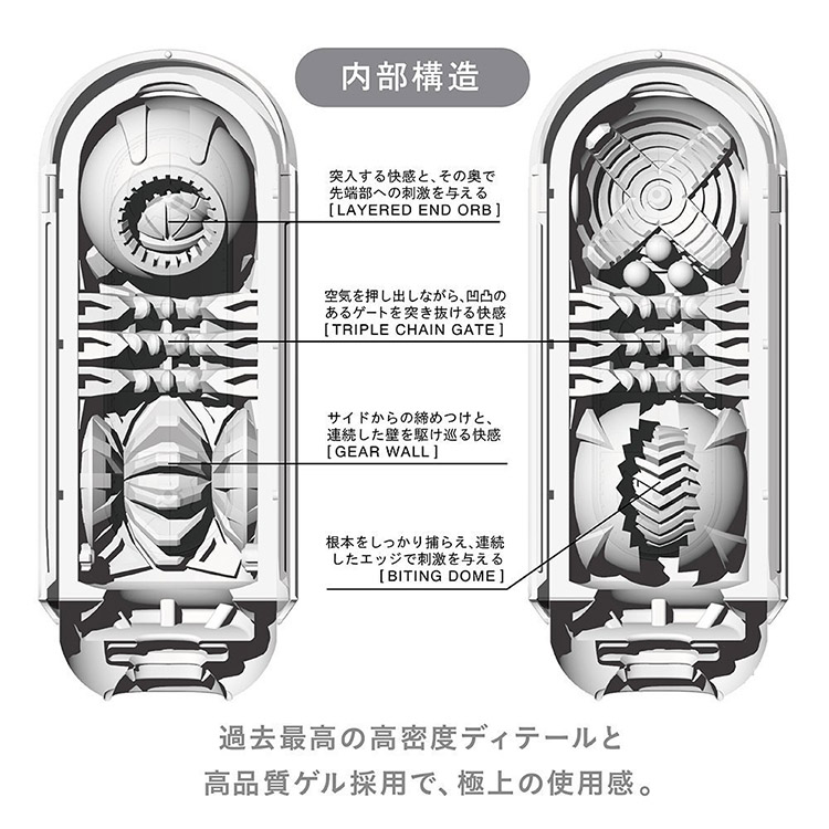 ・ゲルとヒンジが一体となったシームレスな挿入口(インテグレーテッド・ピボット)により、ローション漏れを防ぎ、挿入感と気密性も格段に向上。 ・過去最高の高密度ディテールと高品質ゲル採用(プレミアムテンガと同じ)で、極上の使用感。 ・ワンウェイバルブを設け、プレッシングパッドでバキュームを操作。 ・洗いやすいフリップスタイルに加え、衛生的に保管出来る専用ケースが付属。選び抜かれた素材や、過去最高の高密度ディテール、最新のテクノロジーを駆使し究極の気持ちよさと使いやすさを実現した、未来型FLIP HOLEをお楽しみください。