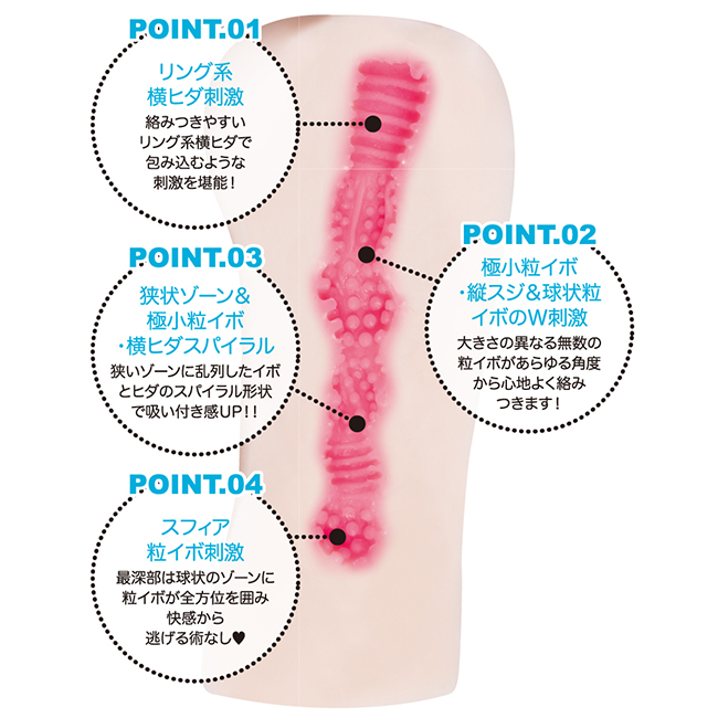 キュートな橋本ありなちゃんとのバーチャルセックスが楽しめる! 清純でアイドル級の可愛いルックスにスレンダーボディの橋本ありなちゃんがホールになって登場!包み込むような吸引力と無数の細かいイボが絡みつく非貫通ホールです!入り口部分は絡みつきやすいリング系の横ヒダが亀頭を包み込むような感覚で刺激。その先には極小粒のイボ・縦スジ&球状粒イボのW刺激で心地よく絡みつき、最深部はスフィアゾーンの粒イボが全方位を囲み、ひっきりなしに快感を与えてくれます。安心の日本製、しっとりローション付き。
