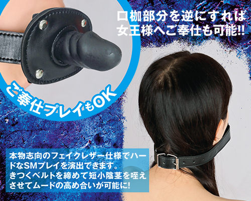 フェイクレザーで本格的なSMプレイが楽しめる! 未知なる快感を呼び覚ます・・・官能的で奥深い、絶対服従のハードプレイが楽しめるSMグッズシリーズ『調教』シリーズに、羞恥と陵辱を兼ね備えた口枷が一挙にラインナップ。本商品は口枷に小さめのディルドが付いた仕様となっております。ディルドが付いている方を内側に持ってくると、イマラチオをさせているかのような羞恥心をあおる事ができます。また外側に持ってくることで、女王様へのご奉仕プレイも可能です。ベルトにはフェイクレザーを使用しているので、本物志向の演出ができます。さらに撥水性もあるため水や汚れにも強くお手入れも簡単です。別売りの首枷と併用することでペットプレイも楽しめます。