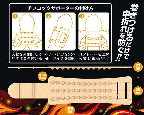 無数のイボ突起が擦れるペニスサポーター!サオに巻くだけで勃起力の向上と中折れを防止する効果を秘めたコックサポーター「チンコックサポーター」の登場です!付け方はサオに巻きつけ、ベルトを穴へ通した後にサイズを調整、その上からコンドームを被せるだけで完了。このハイボールは外側に無数のイボ突起が施されていますので、女性の膣壁をコリコリと刺激します。パートナーと共に長く気持ち良く楽しみたい方にオススメのサポート商品となっております。パッケージサイズ:16.0×6.0×2.0cm