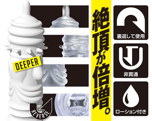 進化系の快感♪ ひっくり返して使用する、透き通るクリアボディが美しいリバースタイプのオナホール。こちらの「ディーパー」は、尿道部分をツンと刺激する先端の突起、全体を擦り上げながら刺激するムーブゲートなど、バラエティに富んだ形状が深く吸い込み全てを搾り取ってくれます。ひっくり返して使用するタイプのオナホールだから、使用後にひっくり返して洗浄することが可能。丁寧に扱うことで、繰り返しお使いいただけるので、コスパ的にも満足していただける仕上がりです。非貫通タイプなので小さめホールですがバキューム力も健在。無限の発射を演出する一本です。