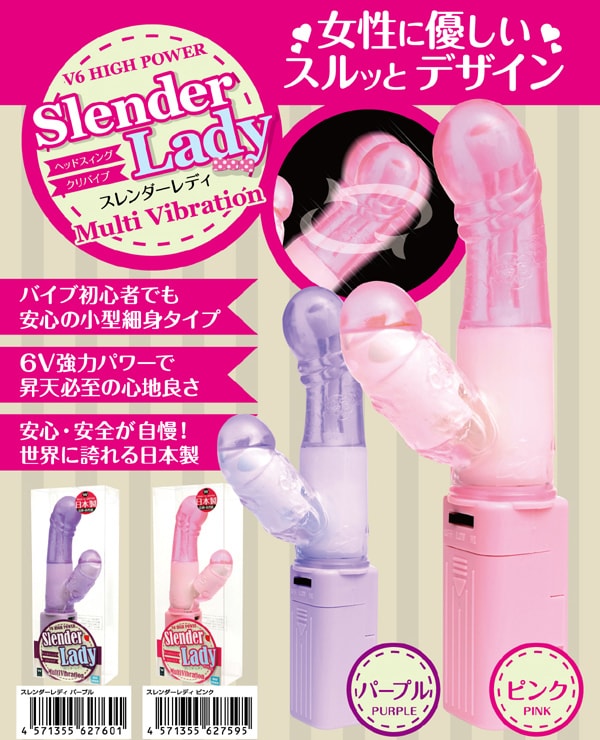 初めてのバイブとして大絶賛! バイブ初心者でも安心してお使いいただける小型サイズのバイブレーター「スレンダーレディ」。操作がとっても簡単でLOW、HIの2段階操作となっています。スイングと子機ローターのバイブレーションが同時に行われるので、無駄な操作が一切ないスリムな使い心地を実現しました。先端部分が絶妙な角度で曲がっていて、Gスポットを刺激するのに最適なデザイン。子機ヘッドも大きく、クリトリスを広範囲でとらえてくれるから、快感ポイントを逃しません。単3電池を4本使用した強力モーターを内蔵し、初心者のみならず上級者の方も満足のいく使用感を味わうことができます。シンプル操作でシンプルデザインが施されたオススメの一本です。