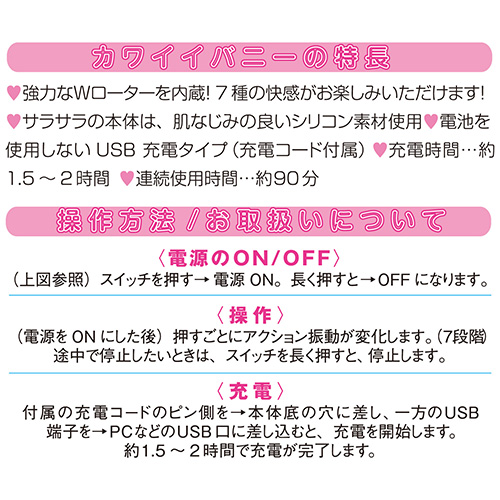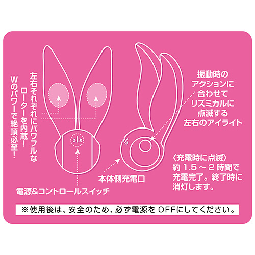 カワイイうさぎさんのデザインで肌触り抜群! カワイイピンクカラーのデザインで女性に大人気の「桜パッション」シリーズ!この「カワイイバニー」は、まんまるお目目の可愛いうさぎさんのバイブレーターとなっています。その特徴的な耳には、強力なモーターを搭載しており、7種類の振動パターンをお楽しみ頂け、振動に合わせて目も光るといった視覚的にも楽しめる仕様となっています。医療用のシリコン素材でコーティングしているので、お肌に優しくサラサラと肌触りの良い質感です。その大きな耳を使って、そのまま挿入しても良し、先端を使ってピンポイント刺激するも良しな、アイデア次第で多彩な使い方ができるバイブとなっております。生活防水なので場所を選ばず、プレイの幅と夢が広がります。USB充電なので、電池要らずのエコな充電方法で楽々です。うさぎさんのエロカワイイバイブレーターで情熱的な夜をお楽しみ下さい!