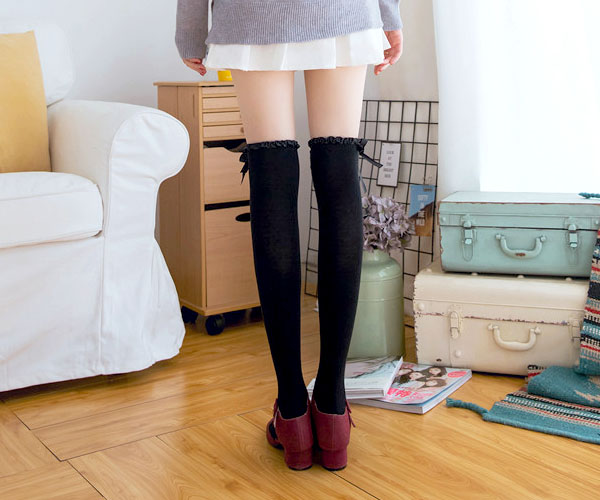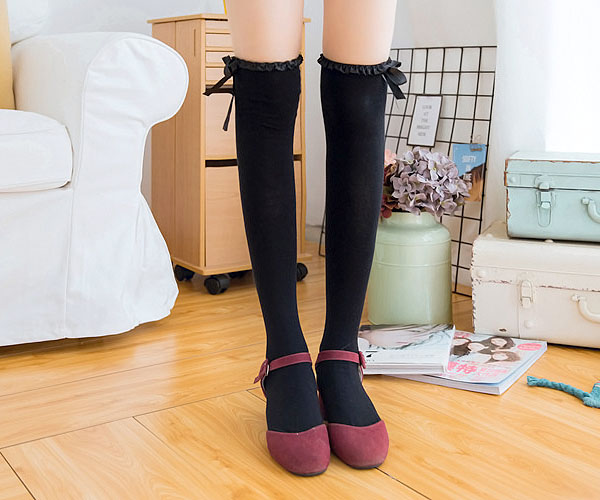 定番の黒ニーハイに、サテンフリルレースとリボンをプラスした大人フェミニンストッキング♪使いやすい無地タイプなのでスカートやショートパンツとも相性抜群☆リボン部分は紐になっているので、お好みで小さめリボンや大きめリボンを作ることが可能です。伸縮性のあるしっかりとした生地なので履きやすさも抜群なニーハイソックスになっています◎サイズ:22〜25cm