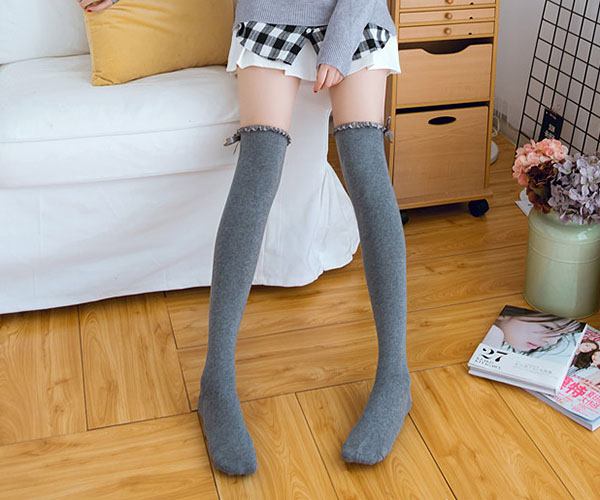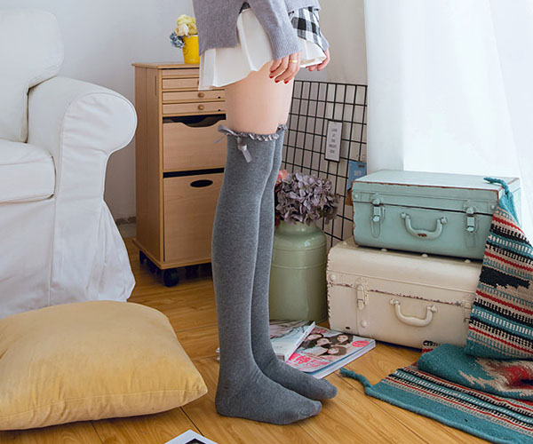 使いやすいグレーニーハイに、サテンフリルレースとリボンをプラスした大人フェミニンストッキング♪使いやすい無地タイプなのでスカートやショートパンツとも相性抜群☆リボン部分は紐になっているので、お好みで小さめリボンや大きめリボンを作ることが可能です。伸縮性のあるしっかりとした生地なので履きやすさも抜群なニーハイソックスになっています◎サイズ:22〜25cm