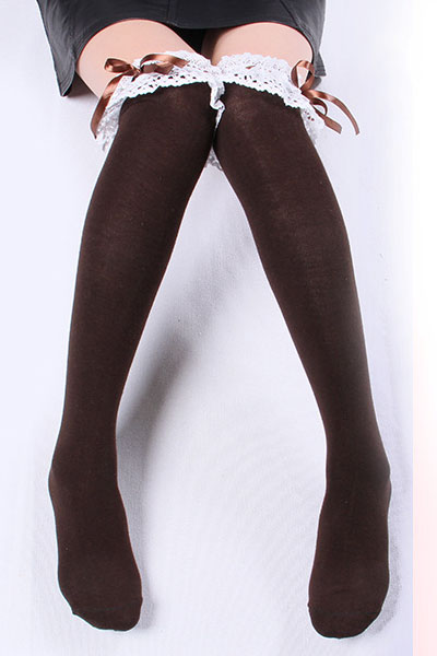 サイドリボンとレース仕様がファンシーなデザイン性の高いキュートソックス☆履き心地のいい伸縮性のある甘めなブラウンのソックスにレースを合せて、シンプルキュートに仕上げています。レースは2段仕様になっているためフリルのボリュームもあり、サテンリボン紐もワンポイントに!リボンはお好みのサイズに合わせて調節が可能です。ミニ丈スカートやメイド服などのコスチュームとも合わせやすいソックスになっています♪サイズ:22〜25cm