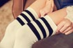 人気の太ももライン入りのニーハイソックスが登場☆履き心地もよく、伸縮性のあるしっかりとした生地を使用しているので、透け感はないですが絶対領域をチラ見せ♪ホワイトのシンプルなソックスを可愛く魅せるブラックのライン入りになっているので太ももをキュッと細くみせる効果あり◎お手持ちのスカートや制服コスチューム等と合わせてもぴったりなカジュアルニーハイになっています☆サイズ:22〜25cmかかとから全体の長さ:54cm