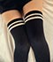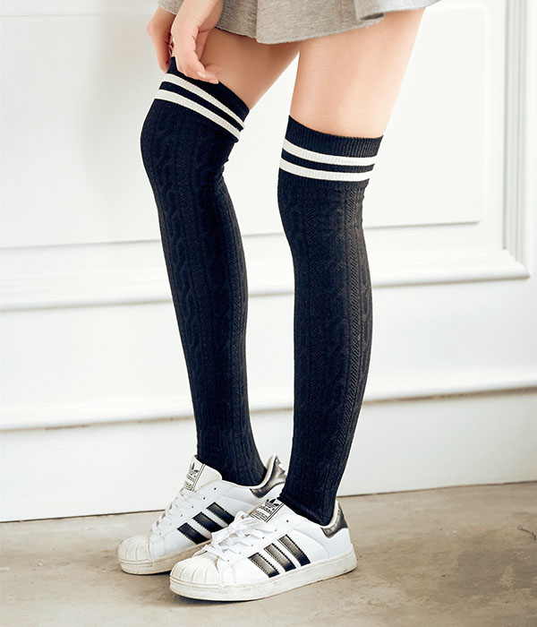 シンプル無地のストッキングやソックスもいいですが、少しだけデザインが欲しいなぁというときにおすすめのケーブル編みソックス♪ブラック生地の太もも部分にホワイトのラインが入っているのでワンポイントとなり、太ももをすっきりと見せてくれます☆触り心地の良い薄手の生地ですが、透け感はなく、しっかりとしたケーブル編みデザインが印象的です◎太ももまで伸ばしてニーハイにするもよし、ふくらはぎでくしゅっと履いてルーズソックスのように崩してもキュートです☆制服コスプレにもぴったりの学生風デザインになっています。サイズ:22〜25cm