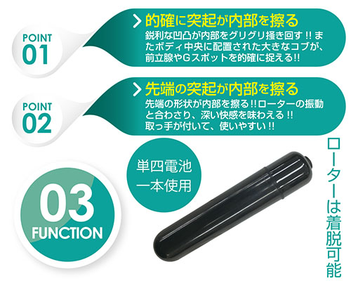 様々な形状でドライオーガズムを呼び起こすスティック型アナルバイブ「プロクト」 先端が鋭利な突起となっているので挿入しやすく、ボディ中央に大きなコブ状となっていて、アナルにぴったりフィットし、下半身を程よく圧迫します。持ち手が付いているのでとっても使いやすく、万が一の時でも安心して抜き取ることができます。ドライオーガズムを楽しむのに適していて、プロクトを挿入し10分程度放置。その後、手を使わずに肛門と玉袋の間にあるPC筋とお尻の筋肉を動かし、これを5〜10分ほど繰り返します。直腸に馴染んだところでローターをスイッチをONすると前立腺と会陰にフィットしたプロクトが震えだし、ドライオーガズムを味わうことができます。ローター部分は取り外しができるので、使用後の本体の丸洗いが可能で、お手入れがラクラクです。前立腺の開発に最適なプロクトで、最高のドライオーガズムを体感下さい!