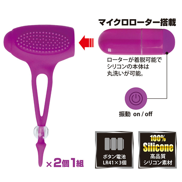 乳首を挟んで刺激するローター 高級シリコン素材と高性能モーターを搭載した乳首ローター「プリティラブ ニップルハングバイブレーター」。中央のリングに乳首を通し、シースルーのストッパーでリングを絞って装着します。リング下に付いているローターのスイッチを入れれば強力振動し、乳首正面への刺激ではなく、挟み込んで乳首全体を刺激する事ができます。またローターを搭載したカバーには無数のツブツブが付いているので、その部分を乳首にあてて乳首正面からの刺激をも楽しむこともできます。素材には高品質のシリコンを使っているので、柔らかく肌触りも良く、長時間プレイできす。ローターの着脱もできるので、シリコン本体は丸洗いが可能となり、簡単にお手入れができます。