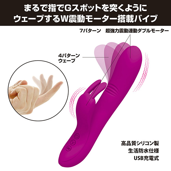 指でかき回されるようなウェービング機能搭載 丸みのあるボディと高品質シリコン素材を採用した「プリティラブ ウェービングバイブレーター」。滑らかな先端がスムーズな挿入感を促し、丸みのある形状が膣にぴったりフィットしGスポットにあたります。持ち手部分にあるスイッチを入れると、まるで指先のように上下にウェービングし、Gスポットを刺激します。本体と子機に高性能モーターを搭載しており、子機の耳のような突起がクリトリスを強力刺激します。ウェービングは4パターン、振動は7パターンのファンクションを搭載。多彩なパターンの刺激で長く楽しめます。生活防水なので場所を選ばずに使用でき、お手入れも簡単です。USB充電なので電池レスでエコです。指でかき回される快感を是非ご体感ください!