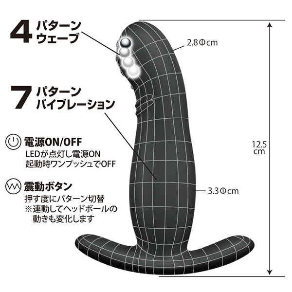 ウェービング+バイブレーションのアナルグッズ バイブの先端に搭載されたボールがグルグルと回り、前立腺を刺激!バイブ中央には、強力なモーターを内蔵しているので、振動をもアナル内部に与えることができ、ドライオーガズムの喜びを感じれること間違いなしです。ウェービングには4パターンのファンクションを搭載しており、振動パターンも7種類と豊富な刺激が楽しめます。高品質のシリコン素材を採用しているので、肌触りが良く、挿入感も抜群で、ストッパーも付いているので安心・安全です。生活防水なので場所を選ばずに使用でき、お手入れも簡単です。USB充電なので電池レスでエコです。