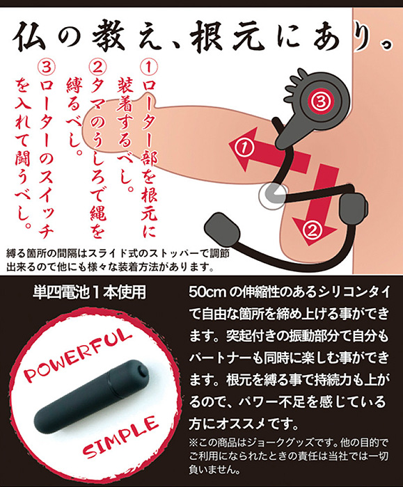 自由自在に男性器を締め付け、射精感と勃起力アップを助太刀致す! 50cmの長さがあるシリコンタイで男性器を自由自在に縛りつける「SUKEDACHINAWA 法」。ローター部をサオの根元の上に装着し、タマの後ろで縄を縛り、ローターのスイッチを入れれば。早漏防止、射精感の向上、勃起力のアップが期待できます。ローターには突起が付いているので、パートナーのクリトリスを刺激したりと、一緒に快感を楽しむことができます。その他にも、多彩な縛り方のできるコックタイとなっていますので、自分自身の理想のサポート体制を構築することが可能です。ローターは着脱が可能なので、使用後のお手入れも楽チンです。射精のコントロールや勃起力アップが期待できる男性に心強いサポートアイテムとなっています!