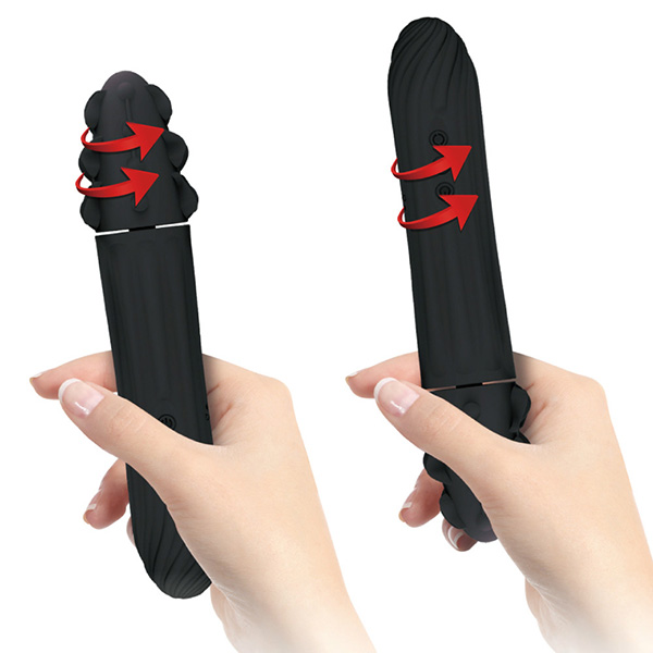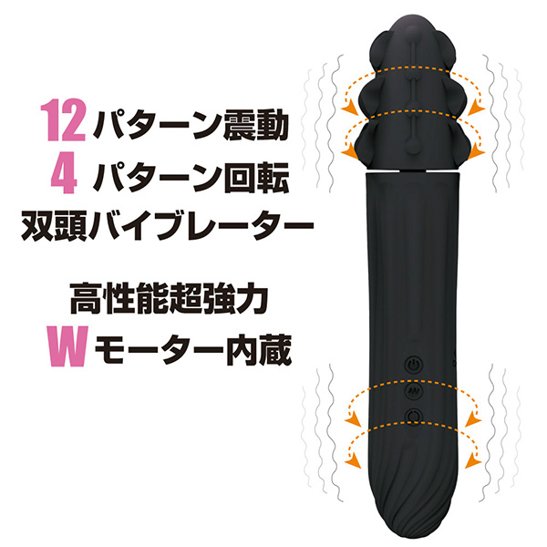 上下形状の異なる先端が回転&振動するバイブレーター ボコボコした先端と、うねったような形状をした先端を持つ双頭のバイブレーター「プリティラブ スクリュードライバー」!両先端ともに高性能モーターを搭載しているので、12パターンの振動と4パターンの回転が可能となっており、幅広い刺激を味わう事ができます。本体は高品質シリコン素材で覆われているので、肌に優しく安全性の面でも高いクオリティを誇っています。さらに生活防水なので、どのシーンでもお使い頂く事ができ、USB充電となっていますので、PC等から簡単に充電できます。高機能なバイブレーターといえば「プリティラブ スクリュードライバー」で決まりです!