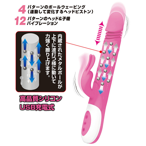 内蔵メタルボールに併せてピストンするバイブレーター バイブ本体に内蔵されたボールが上下に波打ち、尚且つボールのウェービングに併せてヘッドがピストンし、擦り上げるハードな運動を実現したバイブレーターです!サオのあたりに青スジが浮いているのが、脈打つようなボールのうねりをより一層表現してくれています。子機は指のような形状をしており、その柔らかな先端が激しく震え、クリトリスを刺激します。本体の動きはボールウェーブに連動して変化するヘッドピストンが4パターンとなっており、子機はヘッド&子機のバイブレーションが12パターンとなっています。高品質シリコンで覆われているので激しい動きでも、お肌には優しく安全にできていて安心です。生活防水&USB充電式となっていて、高機能なバイブレーターなのでどなたでも満足いただける1本です!