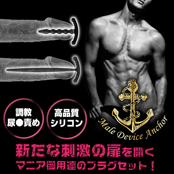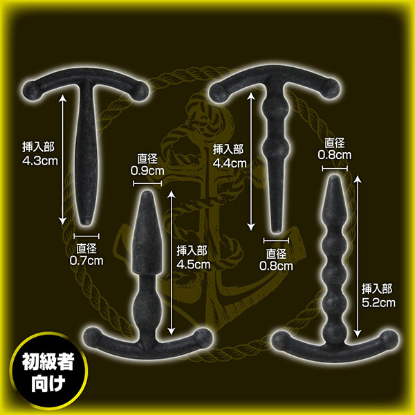 尿道責めの初心者用4点セット 尿道から精液が出る瞬間は気持ち良いといわれていますが、同じように尿道を何かが通るという事は気持ちいいとされています!「ならば尿道に何か入れようじゃないか!」そんな新ジャンルの尿道責めグッズが「メイルデバイスアンカー」です!こちらの「ビギナー」は初心者用となっており、4種類の形状の異なるプラグがセットになっていて、長さは少し短めなので尿道開発にはうってつけです。真っ直ぐのものから凸凹になっているものまで様々な形となっていて、T字型形状がストッパーになり挿れすぎを防ぎます。高級シリコン素材を使っていますので、お肌に優しく尿道を傷つけることがないので安心です。貴方も尿道責めという快感に嵌ること間違いなしです!