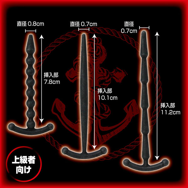 尿道責めの上級者用3点セット 尿道から精液が出る瞬間は気持ち良いといわれていますが、同じように尿道を何かが通るという事は気持ちいいとされています!「ならば尿道に何か入れようじゃないか!」そんな新ジャンルの尿道責めグッズが「メイルデバイスアンカー」です!こちらの「アドバンス」は上級者用となっており、3種類の形状の異なるプラグがセットになっていて、長さはかなりロングサイズとなっているので、ある程度尿道責めに慣れて通常の長さではもの足りなくなってきた方向けです。真っ直ぐのものから凸凹になっているものまで様々な形となっていて、T字型形状がストッパーになり挿れすぎを防ぎます。高級シリコン素材を使っていますので、お肌に優しく尿道を傷つけることがないので安心です。貴方も尿道責めという快感に嵌ること間違いなしです!