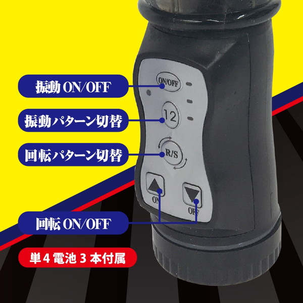 タマ有りイカせる快感バイブ スイングとバイブレーション機能を搭載した、初心者にも優しいスリムなヘッドが特徴のバイブ「イカす!番長バイブ」。スイングは3段階スピード調節が可能となっており、リバース機能も搭載。さらに、本体内部に搭載されたパールも回転するので、しっかりと内部をかき回してくれます。バイブレーションは12パターンのファンクションを搭載しており、様々な振動パターンでアナタを一気に昇天させてくれます。スイングとバイブレーションは別々に操作することができるので、スイングのみ、バイブレーションのみといった操作も可能です。高性能でイカせてくれる、コスパ最強のバイブです。