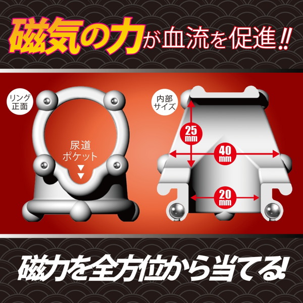 磁気の力で勃ち上がれ!本体のあらゆる部分に磁気を取り付けた男性補助グッズ「JIKIMARU-磁気丸-」。どの方向からも磁気を力を感じ取ってもらえるので、血流を促進してくれます。装着は、竿と睾丸をガッチリホールドし、磁気のパワーと相まって男性器を力強く、たくましく変貌させてくれることでしょう。本体サイズ:フリーサイズパッケージサイズ:14.8×9.8×4.0cm